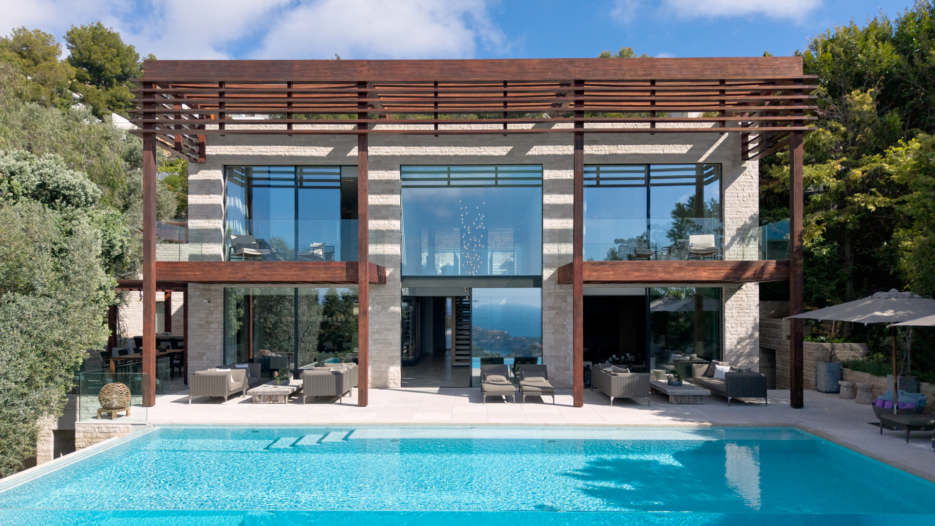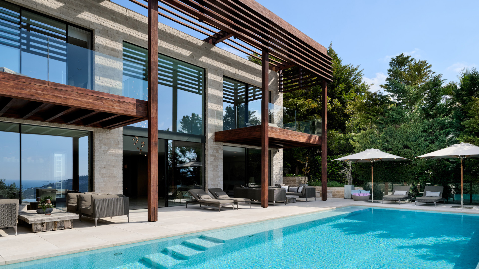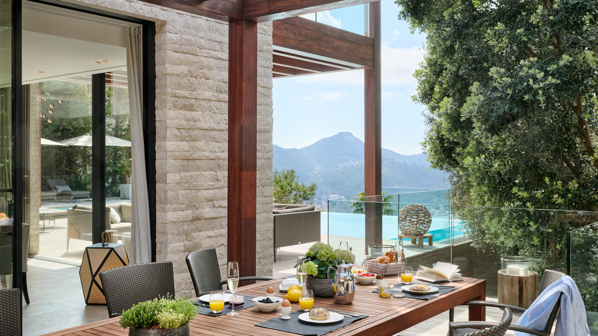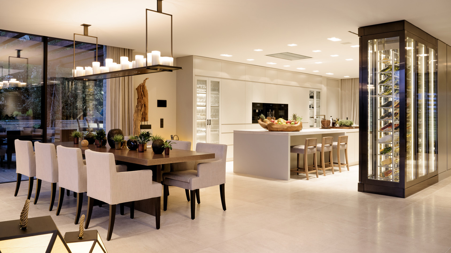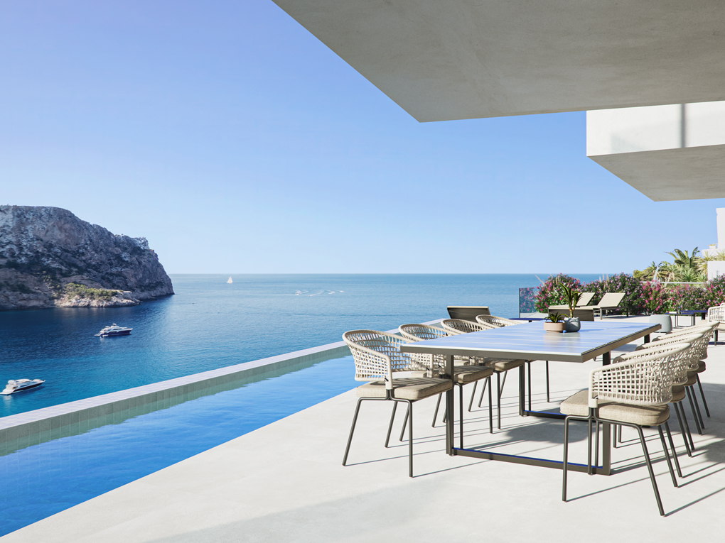 Ein großzügiger Wohn- und Essbereich mit offener Küche öffnet sich vollständig zu den Terrassen und dem Infinity-Pool. Großflächige Verglasungen schaffen fließende Übergänge zwischen Innen- und Außenbereich und lenken den Blick gezielt auf den Hafen und das Meer.