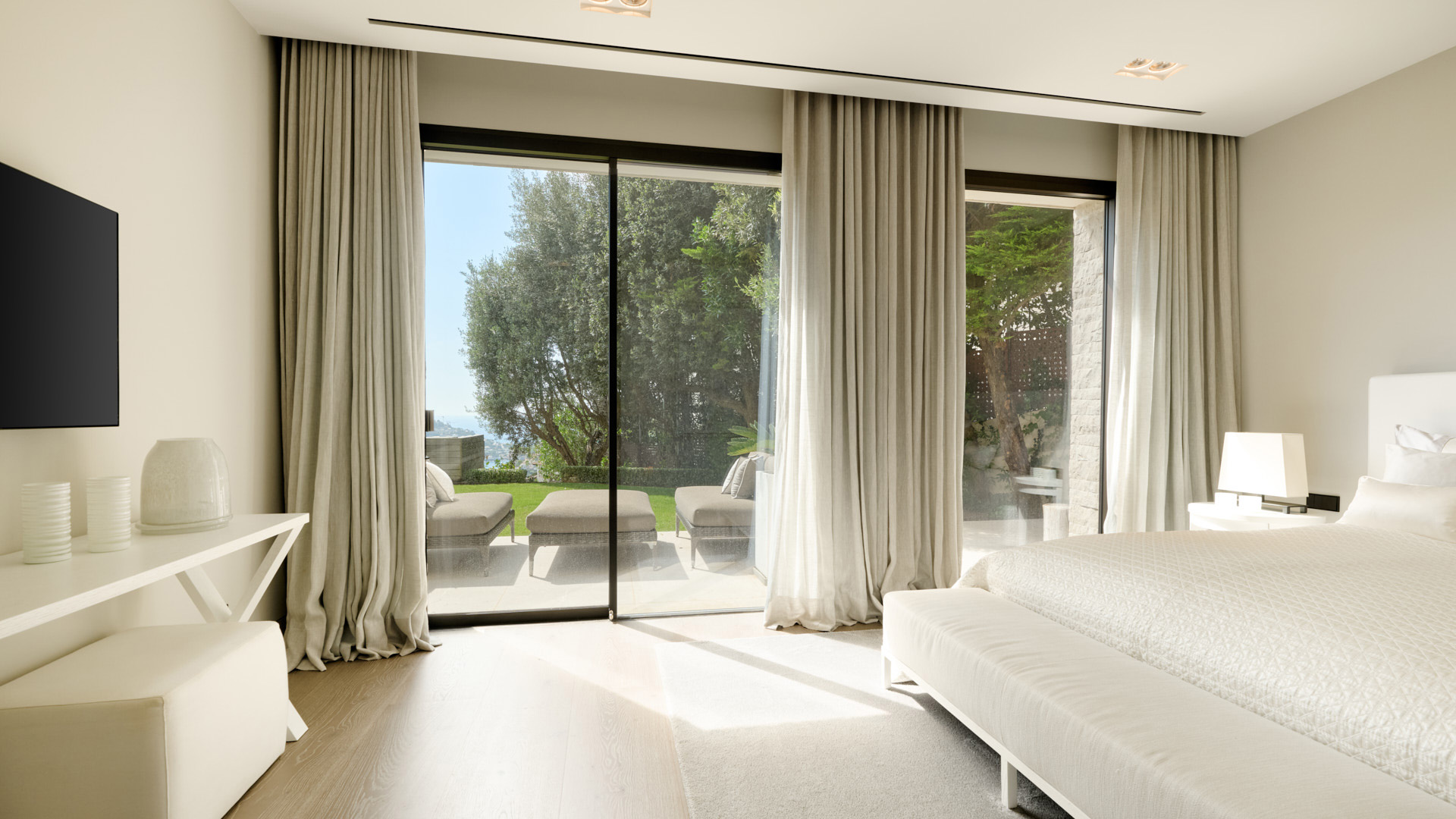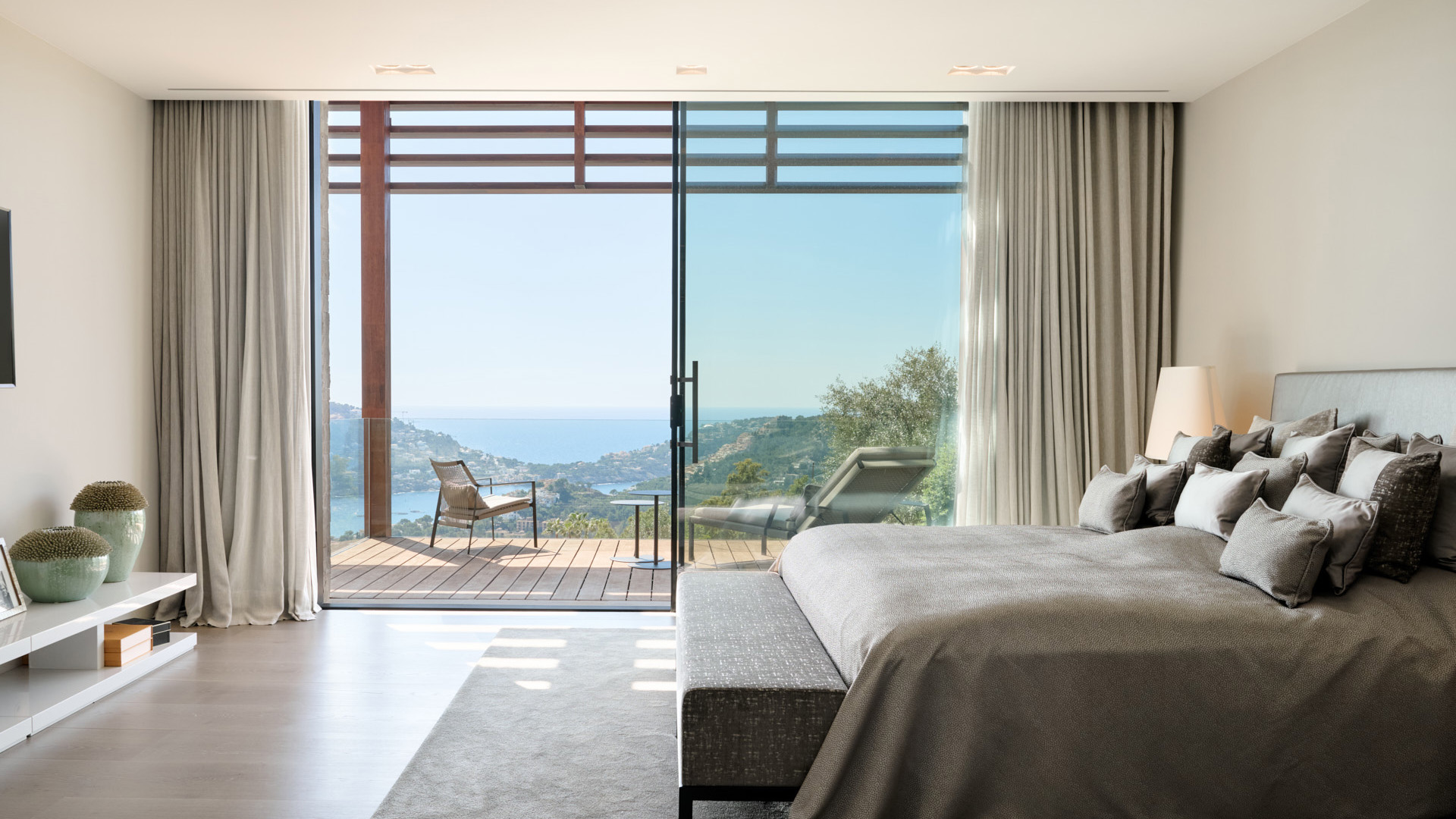 Die Master-Suite mit Bad en suite, großzügiger Ankleide und Terrasse bildet einen eigenständigen Bereich und ist auf den Blick über den Hafen und das Meer ausgerichtet. Ergänzt wird diese Ebene durch zwei weitere Schlafzimmer mit Bad en suite, eines davon mit privatem Balkon zum Meer.
