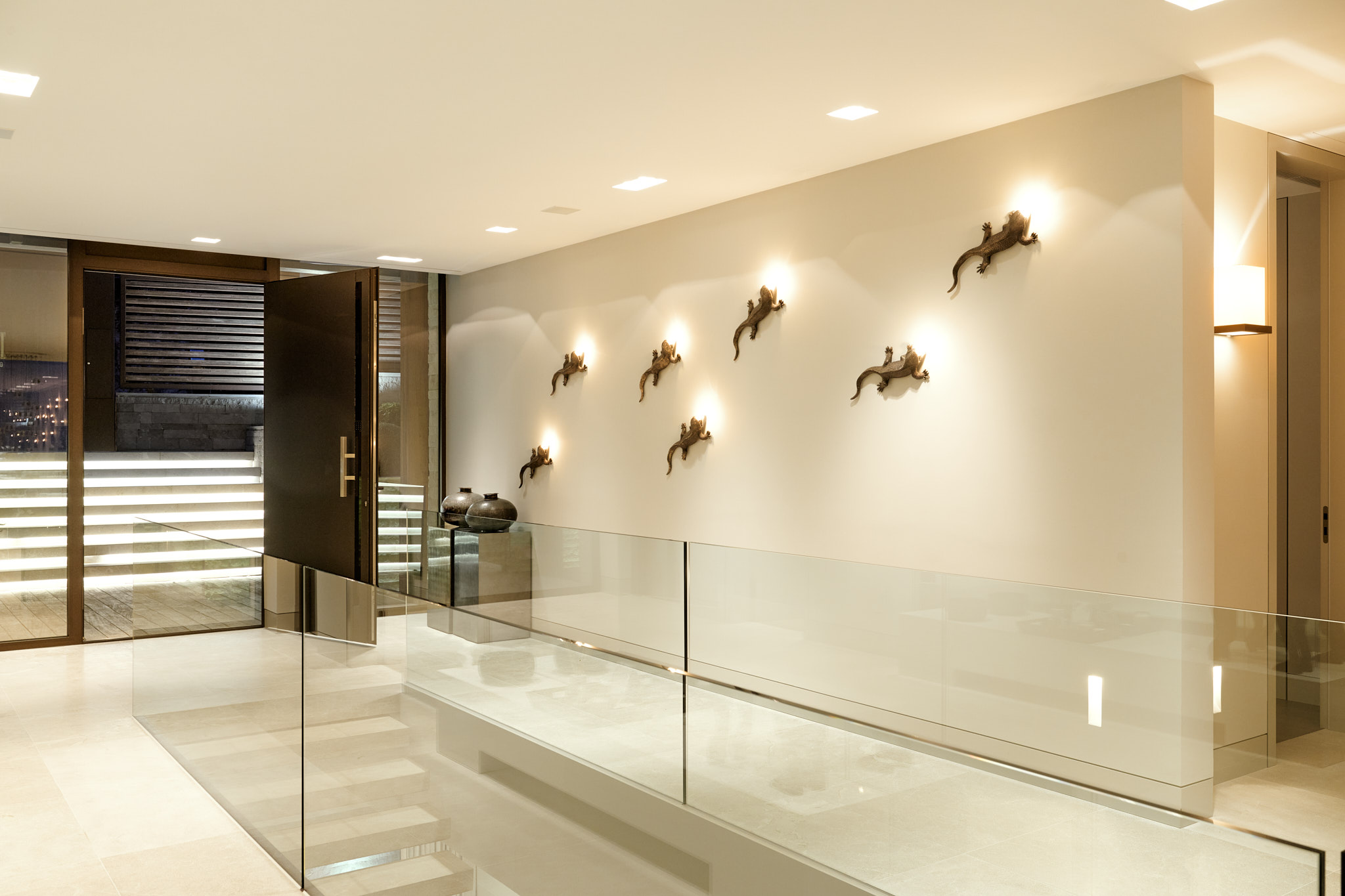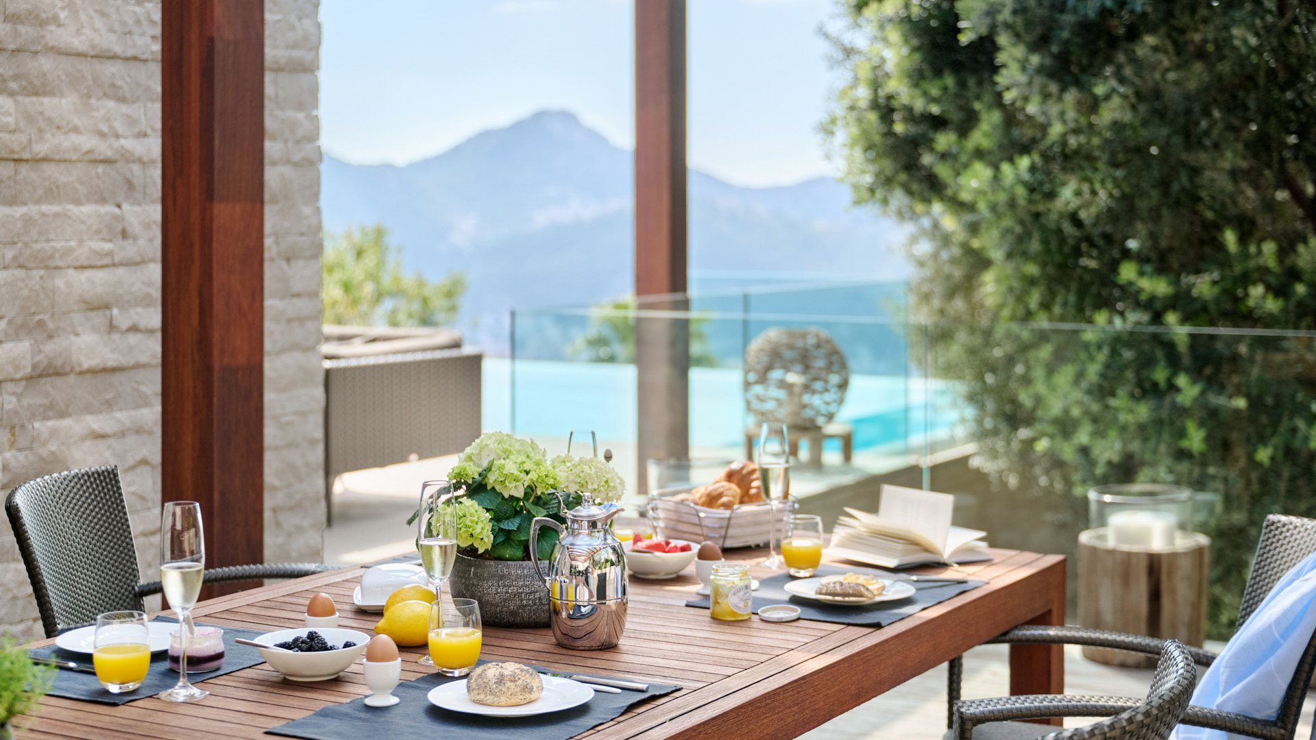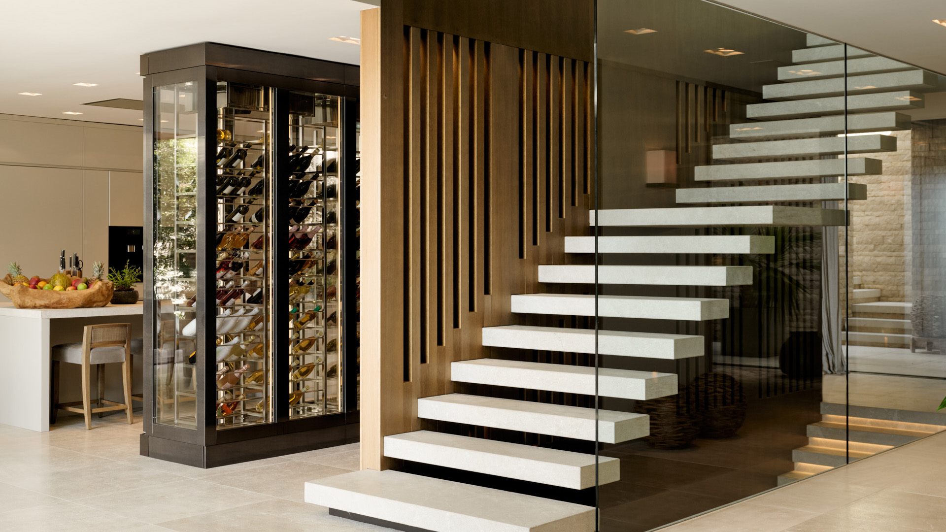 Ergänzt wird diese Ebene durch eine separate Arbeitsküche, ein Büro sowie einen teils geschützten Innenhof mit Wasserkaskade. Der Außenbereich mit Küche und Essplatz ist direkt angebunden und erweitert das Wohnkonzept nach außen.