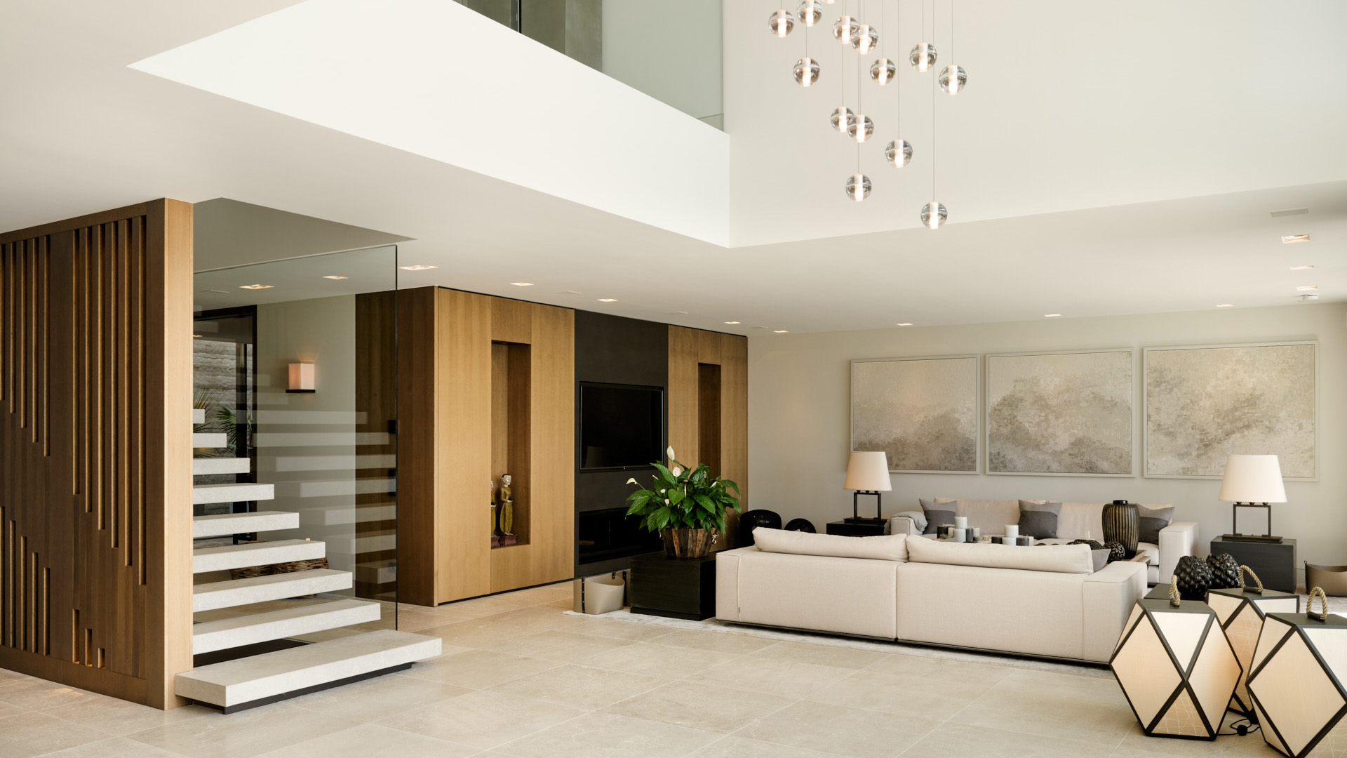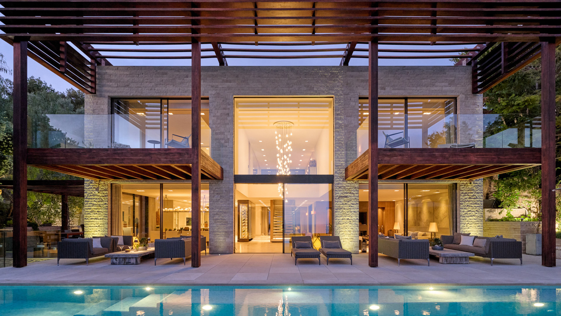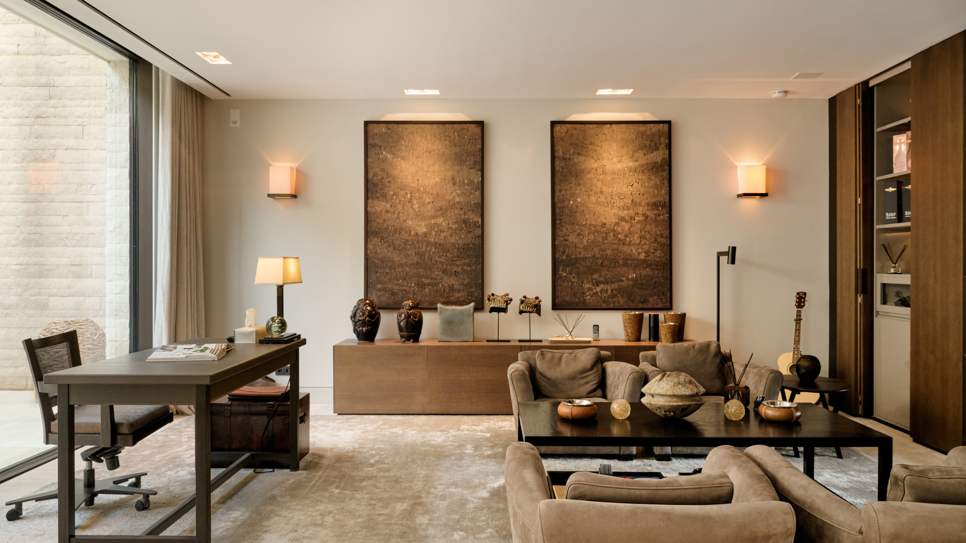 Ergänzt wird diese Ebene durch eine separate Arbeitsküche, ein Büro sowie einen teils geschützten Innenhof mit Wasserkaskade. Der Außenbereich mit Küche und Essplatz ist direkt angebunden und erweitert das Wohnkonzept nach außen.