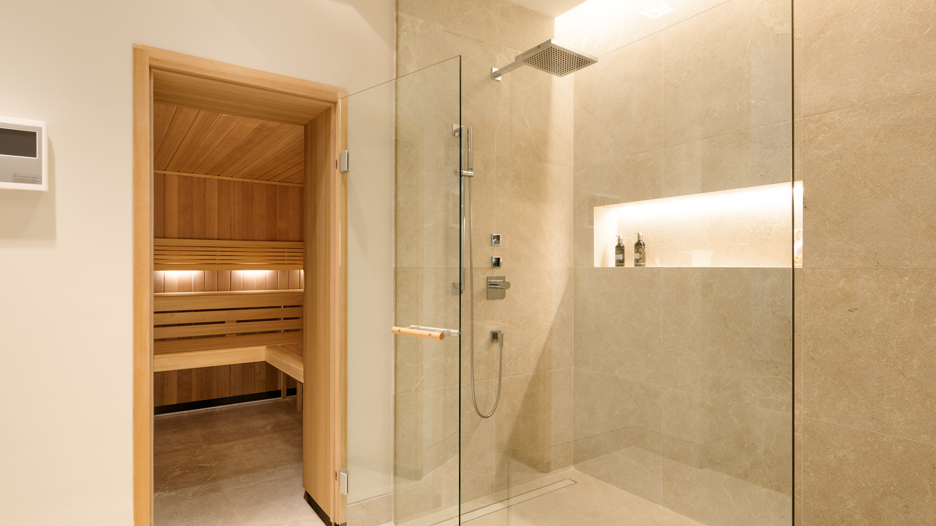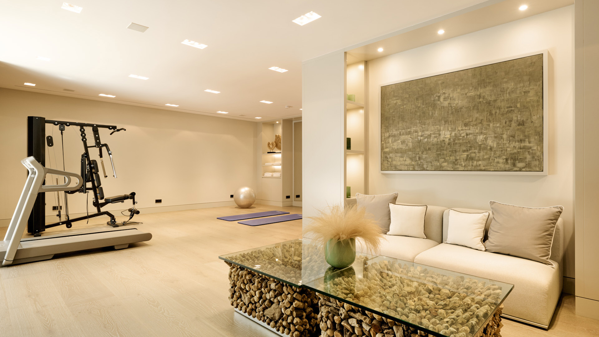 Auf den unteren Ebenen befinden sich ein Fitness- und Wellnessbereich mit Sauna sowie Hauswirtschafts- und Technikräume.