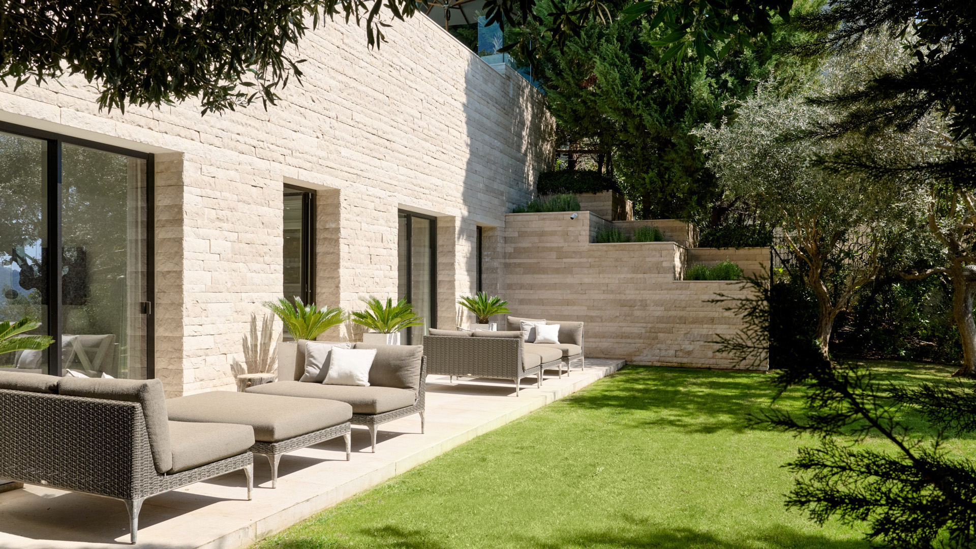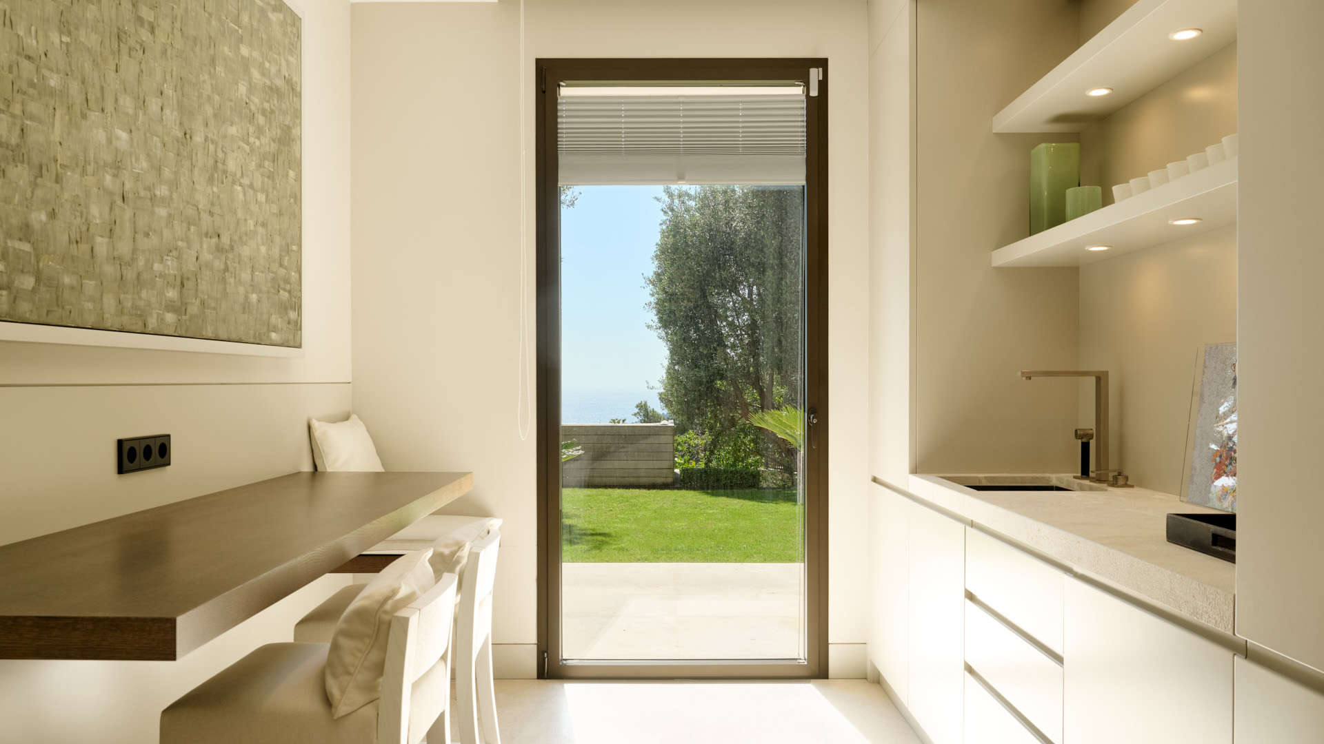 Darüber hinaus stehen zwei Schlafzimmer mit Bad en suite und direktem Zugang zu Terrassen- und Gartenbereichen zur Verfügung. Eine integrierte Küchenlösung ergänzt diese Ebene.