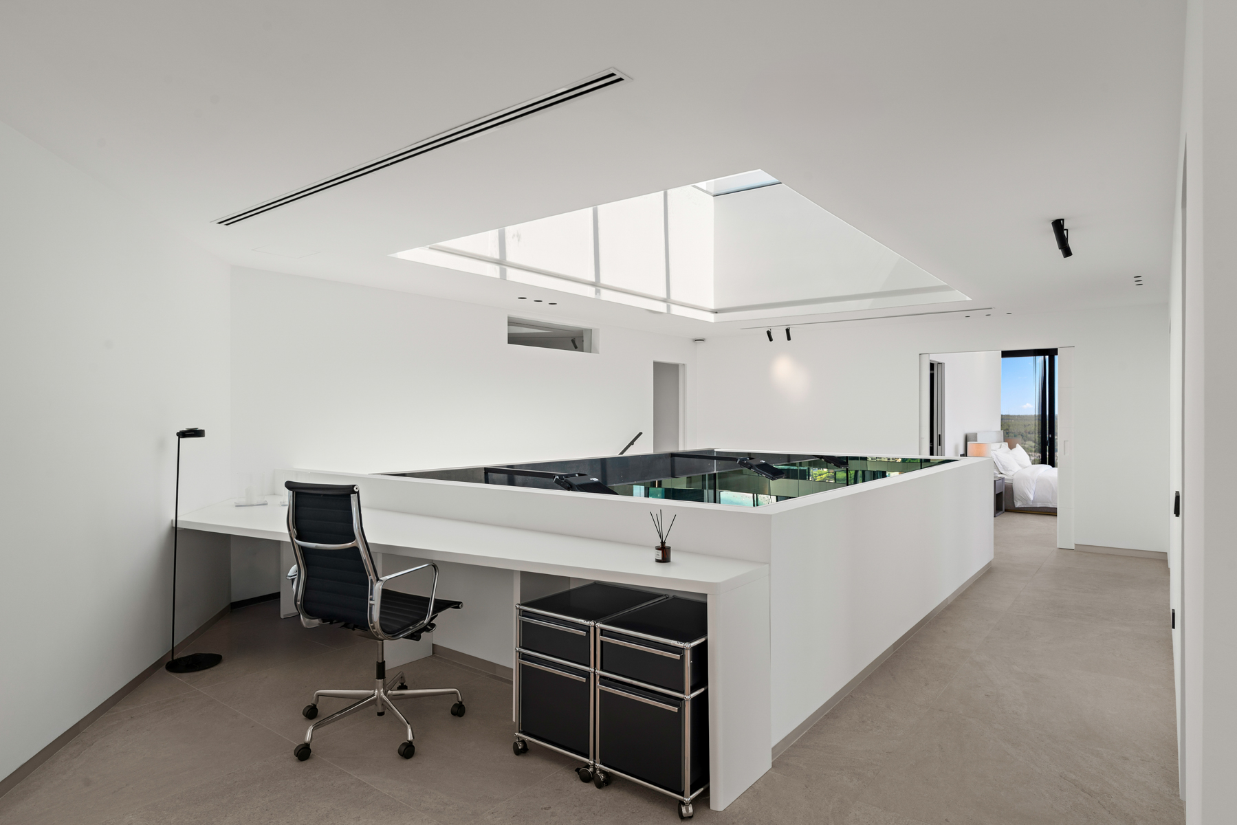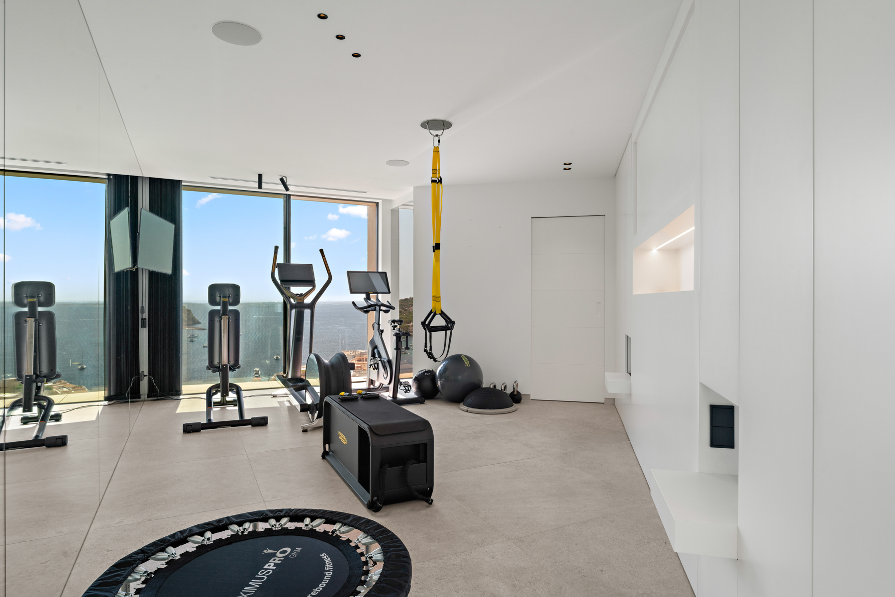 Das Obergeschoss bietet zwei Master-Suiten mit begehbaren Kleiderschränken und ein zusätzliches Schlafzimmer, jeweils mit eigenem Bad en Suite. Der Fitnessraum, ausgestattet mit einem eigenen Badezimmer, ermöglicht ein Training mit Blick auf das Meer.