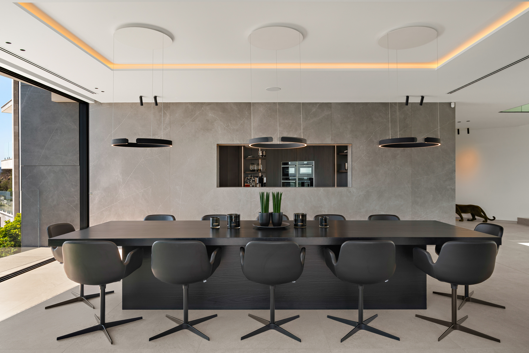Das Erdgeschoss beeindruckt mit einem großzügigen Wohnbereich, der durch seine offenen Raumstrukturen und den spektakulären Weitblick eine besondere Wohnatmosphäre schafft. Ein stilvoller Kamin unterstreicht den eleganten Charakter dieses Bereichs. Angrenzend befinden sich der Essbereich sowie die moderne, hochwertig ausgestattete Küche. Ergänzt wird diese Ebene durch den Infinity-Pool mit Meerblick sowie ein komfortables Schlafzimmer mit Bad en Suite.